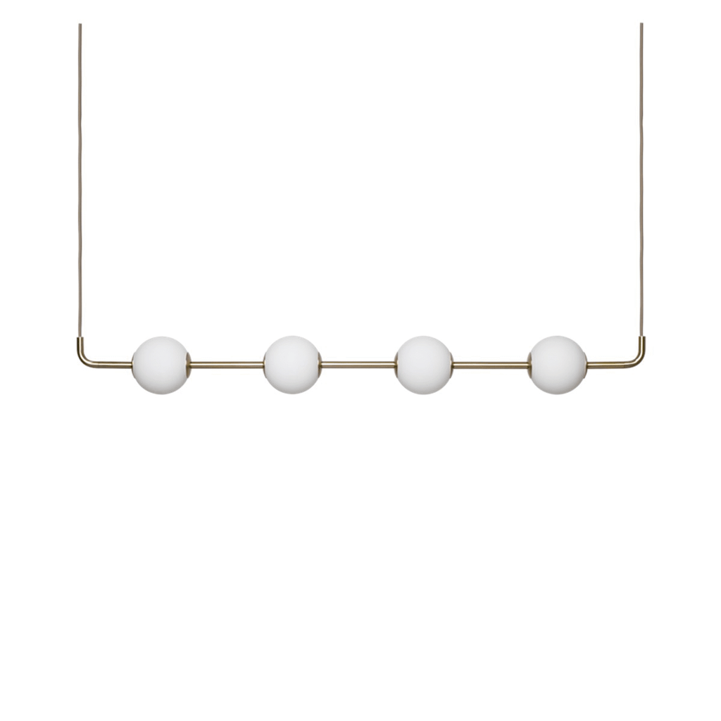Audrey Linear extends the timeless aesthetics of the Audrey collection into a refined horizontal pendant. With four opal glass globes suspended on slender brass stems, it diffuses a soft, balanced glow, perfect for dining areas, kitchen islands, or minimalist interiors. Combining mouthblown glass with elegant brass detailing, it brings sophistication and warmth to any space.