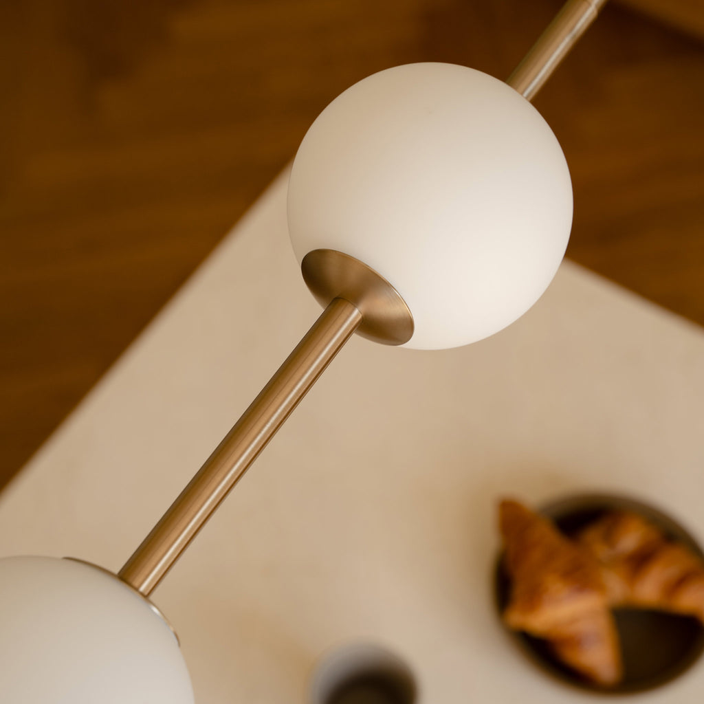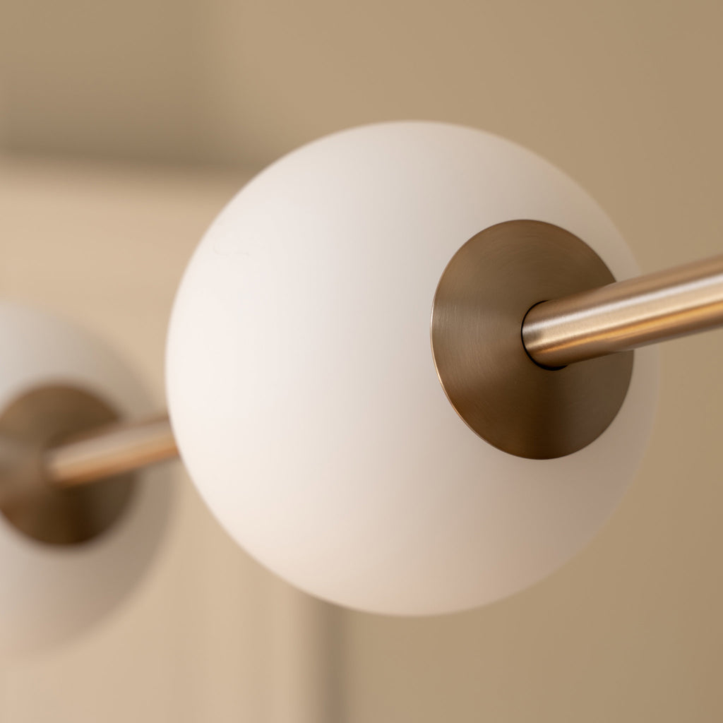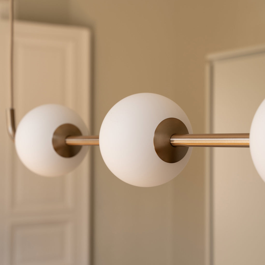 Every part of the construction has been considered to keep the design both durable and visually cohesive. The brass stems connect the glass globes with precision, while the slim canopy and discreet suspension system reduce visual noise and highlight the glowing glass. The use of high-quality brass not only gives the fixture a refined appearance but also ensures long-lasting stability.
