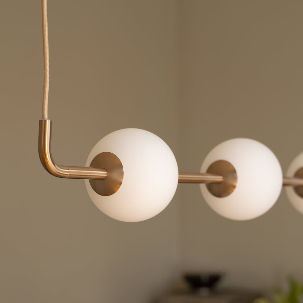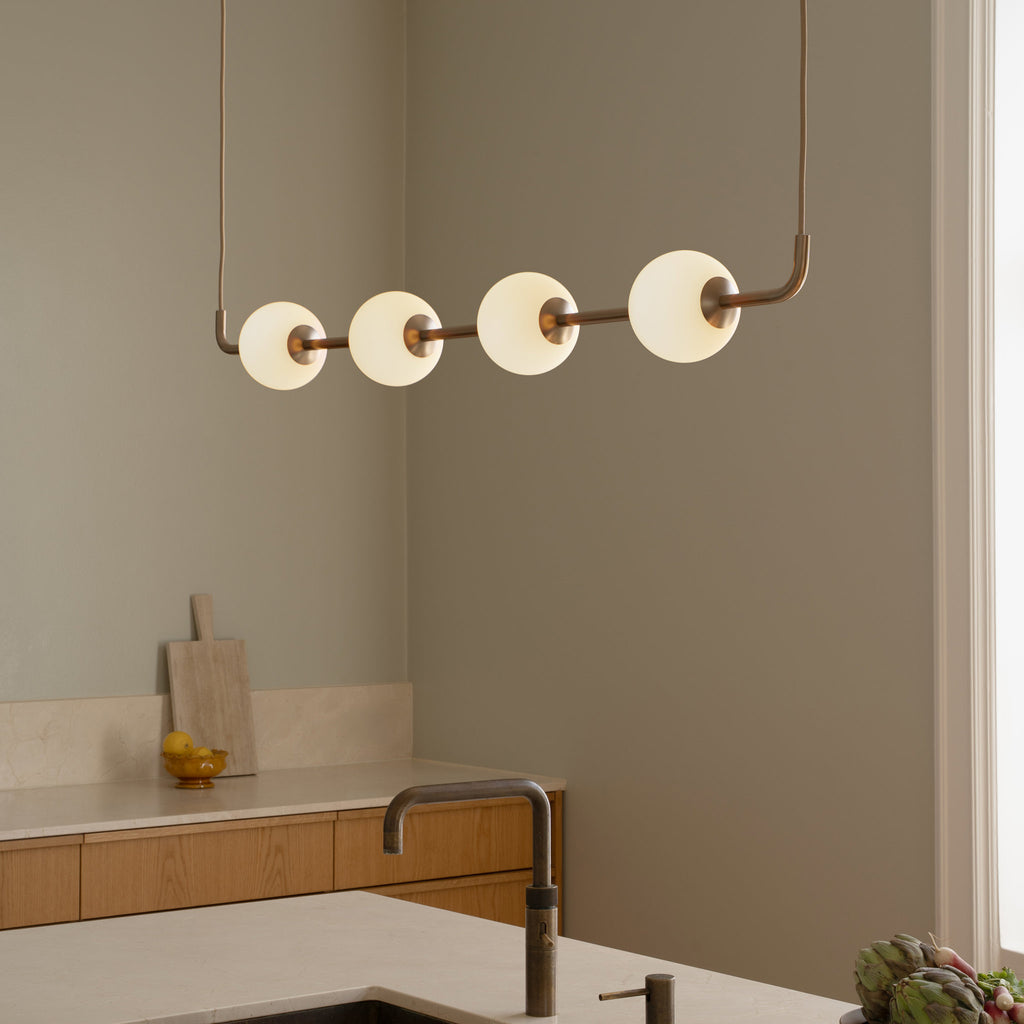 Audrey Linear is designed with four opal glass globes mounted along a slim brass frame, creating a balanced linear form that provides consistent, glare-free lighting. The opal glass ensures a soft, even distribution of light, making the pendant ideal for positioning above larger surfaces such as dining tables, kitchen islands, or work desks where both function and atmosphere are required.