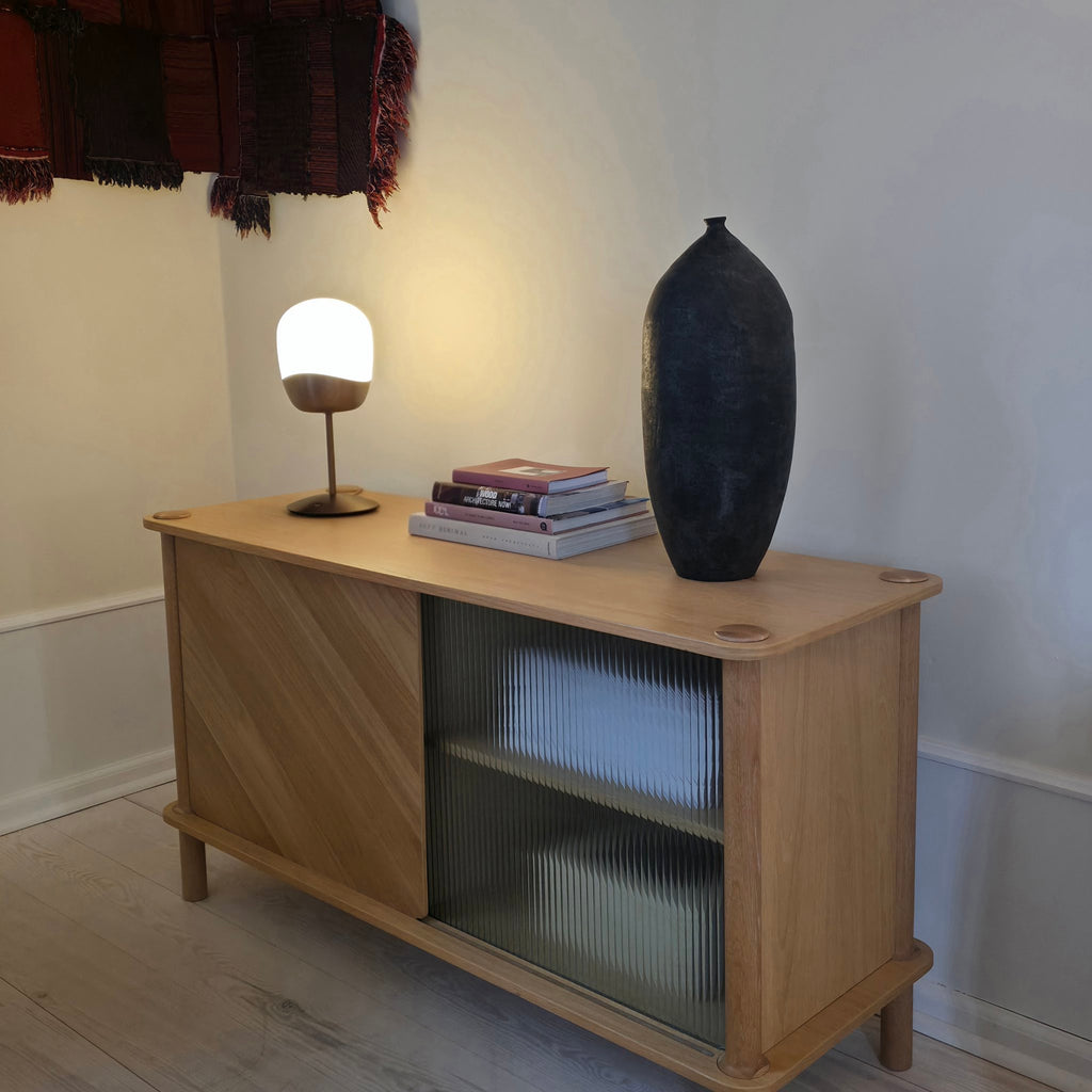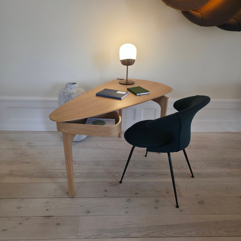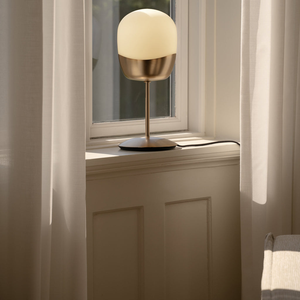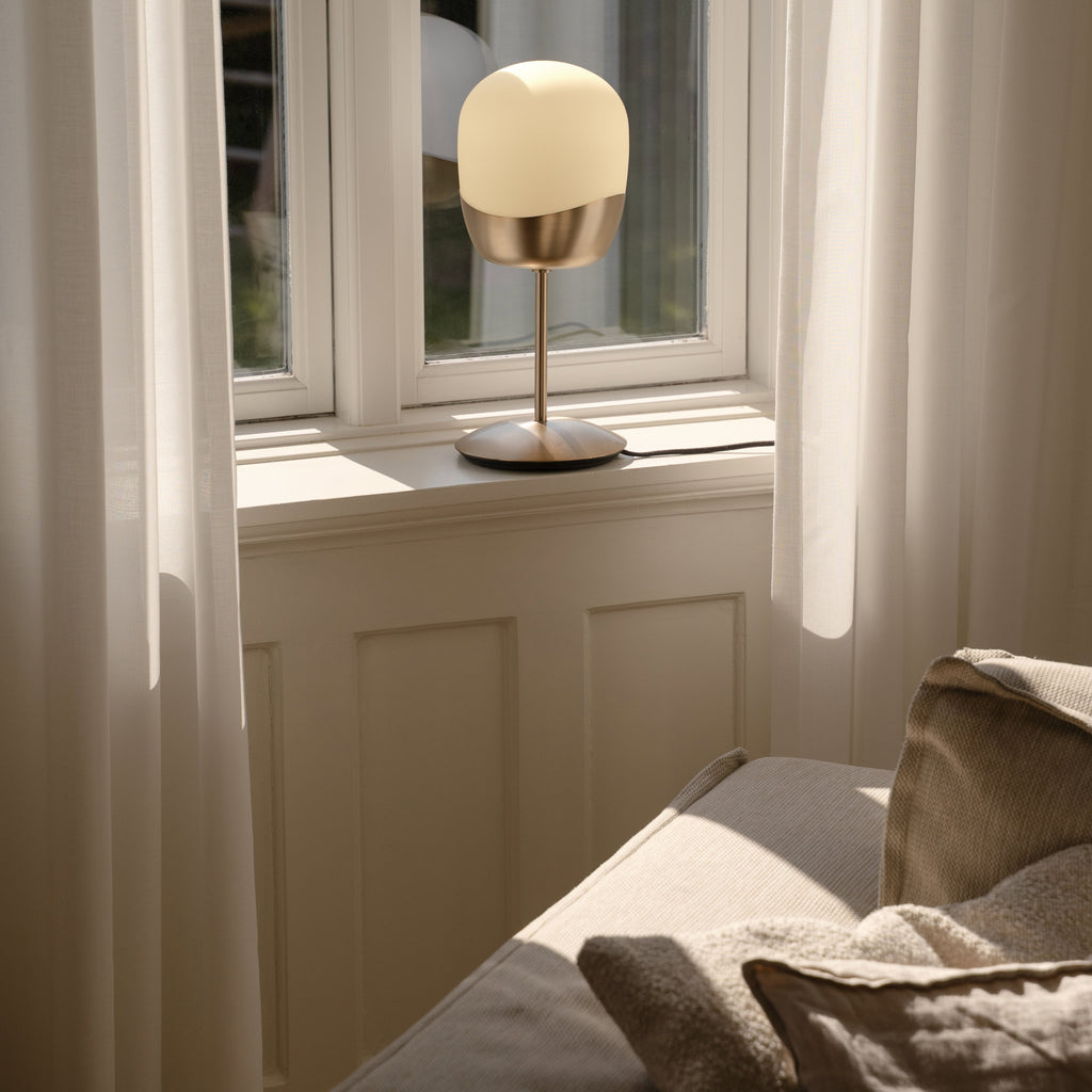 Spring Table is a tactile and sculptural table lamp designed for calm, atmospheric lighting. Crafted from mouthblown opal glass with a bold, asymmetrical brass base,...
